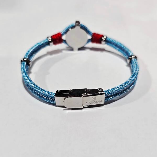 El azul celeste y el rojo se entrelazan en un cordón que recuerda al horizonte marino y al fuego interior. El azul evoca la calma del océano y la claridad de los sueños, mientras que el rojo simboliza la valentía y la pasión que nos impulsa a avanzar.